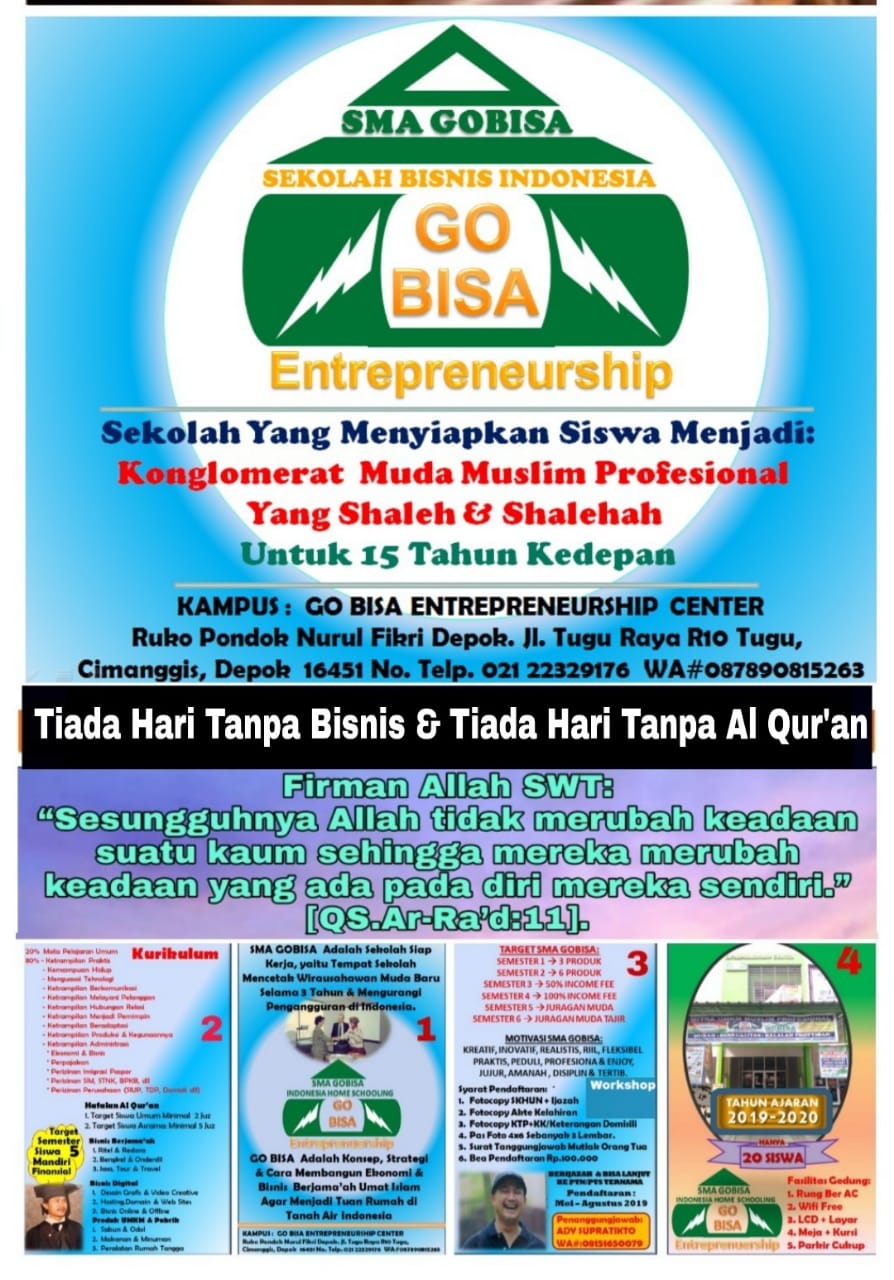 Maka tahun ajaran 2019/2020 berdiri Sekolah Bisnis Indonesia SMA GOBISA yang Kurikulumnya 20% Kehidupan Riil &